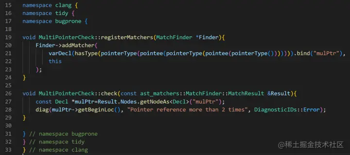 在bugprone目录下,自动生成了MultiPointerCheck.h/cpp两个文件并填充了check的默认模板,我们只需要修改这两个文件,然后重复上文所述的编译过程,就可以用到自己的check啦