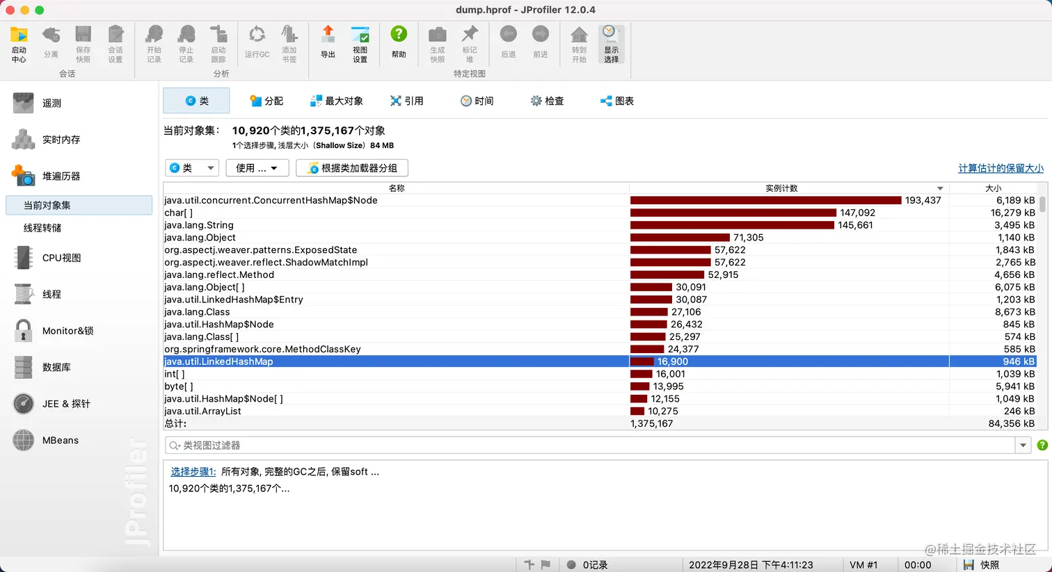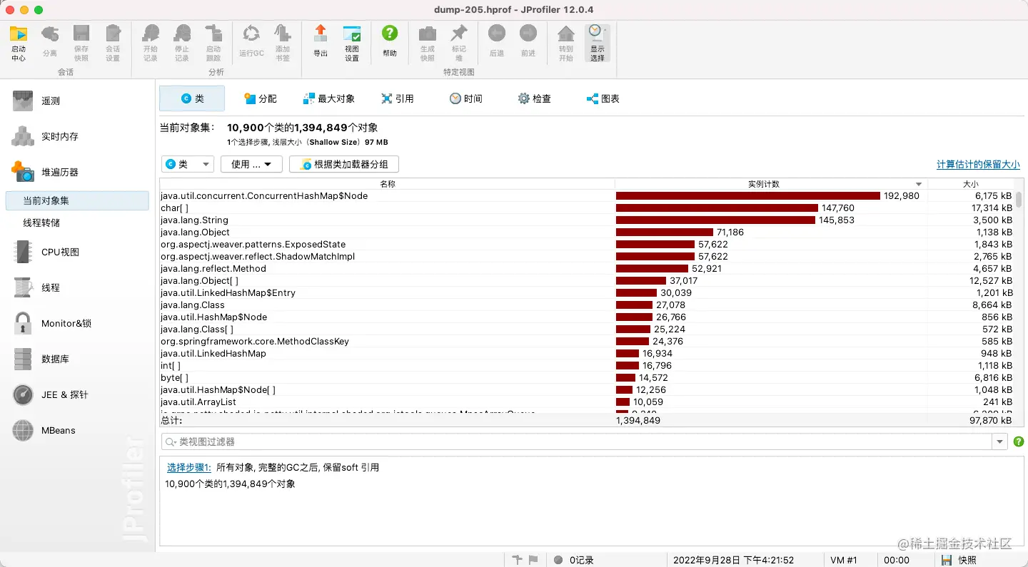 - 3、通过 heap dump 分析,token-service-deployment-79b9669479-255vl dump 下的文件是 2.31G,token-service-deployment-79b9669479-zdvgm 是464M。通过 jprofile 分析,在删除弱引用和无效引用的情况下,heap 使用情况基本一致,都没有大对象情况,也就是说,内存占用多的 pod 如果 GC 频次起来之后,相应的内存肯定是会降来下的,因为堆中存在大量未引用和无效引用的情况对象没有被回收。