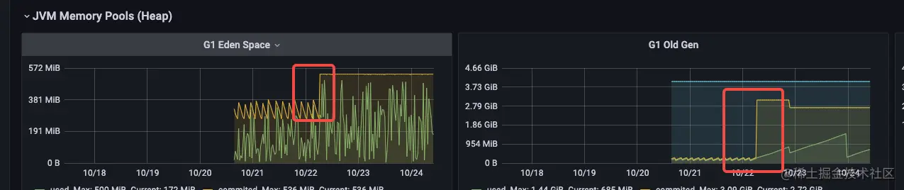 初步是先通过调整新生代大小来观察各 POD 的堆使用情况是否能够限制在一个比较合理的范围之后: