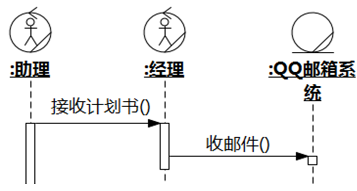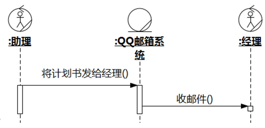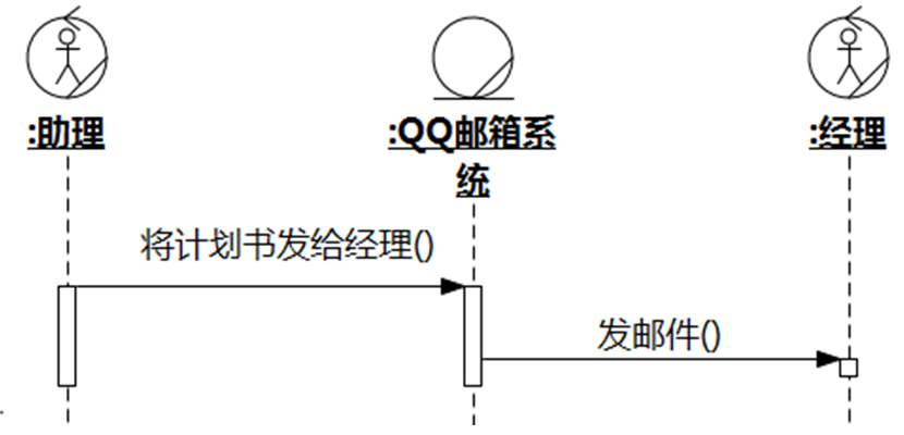 在业务流程中有这么一步:助理使用QQ邮箱系统将计划书发给经理。如果QQ邮箱系统在业务流程中有重要的地位,不得忽略,那么以下序列图片段描述了该步骤而且责任分配合理的是: