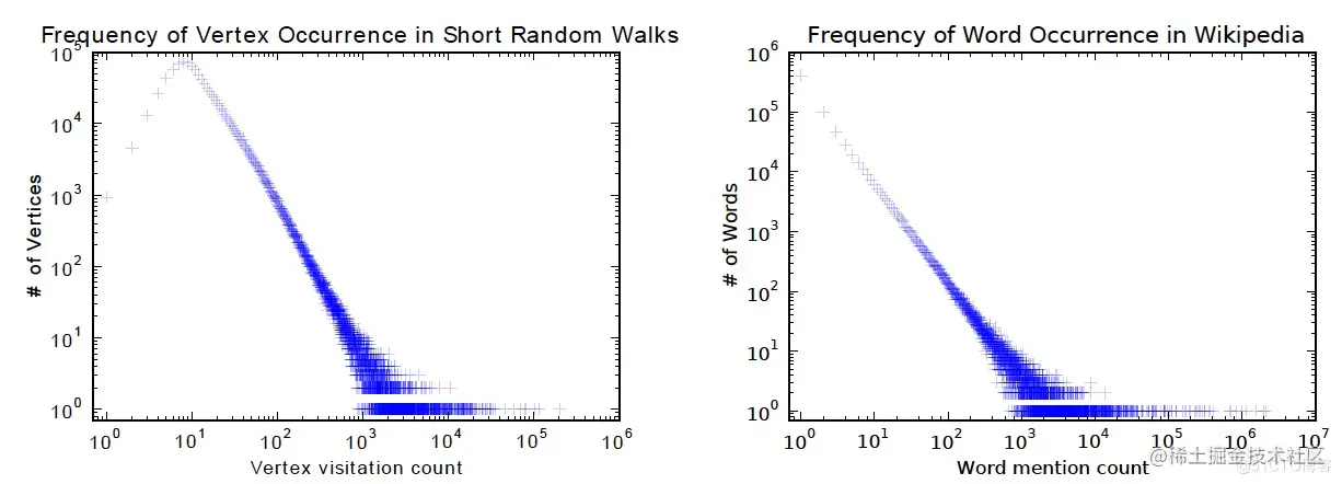 该方法能够成立的核心原因是:图中的节点和语料库中的单词的分布都遵循幂定律,我们可以利用基于大量数据的学习方法来找出节点之间、单词之间的规律。