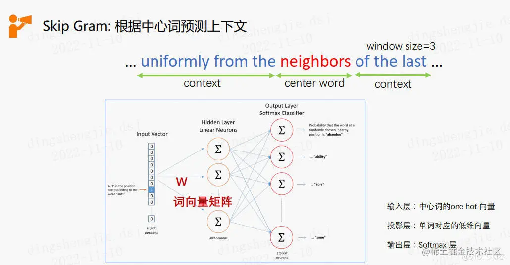 以下面这张图片的句子为例,假设 neighbors 为中心词,同时我们设置了window size为3. 这个窗口大小表示左右两边的上下文词数,因此 neighbors 的 context 为 uniformly from the,以及 of the last。