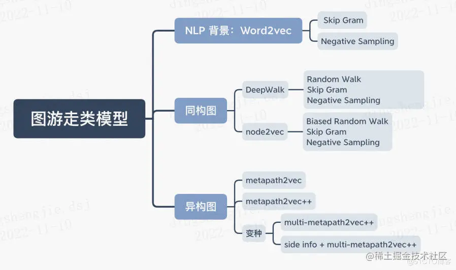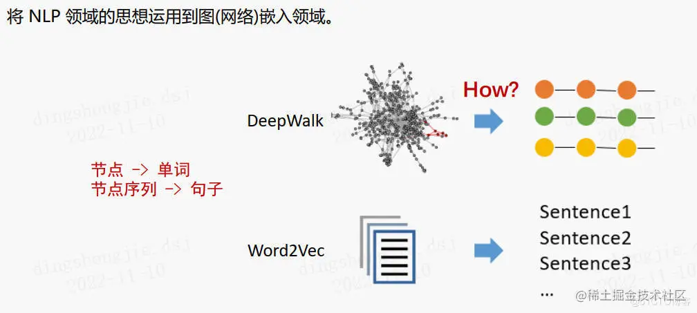 游走模型的鼻祖是DeepWalk模型,它也是第一个将 NLP 领域的思想运用到图嵌入领域的模型。