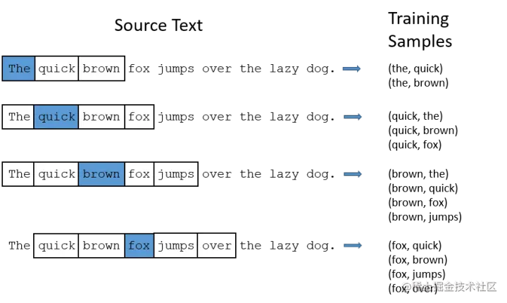 我们选定句子“The quick brown fox jumps over lazy dog”,设定我们的窗口大小为2,也就是说我们仅选输入词前后各两个词和输入词进行组合。下图中,蓝色代表input word,方框内代表位于窗口内的单词。