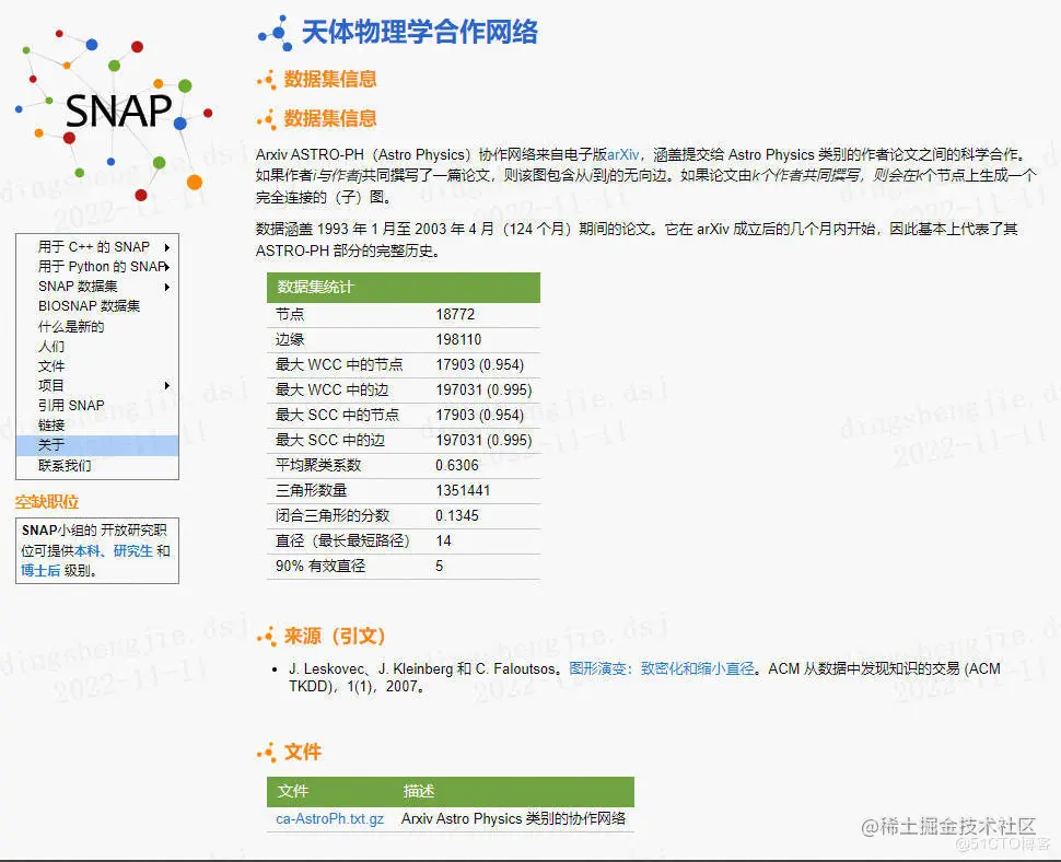 Arxiv ASTRO-PH(天体物理学)协作网络是来自电子版预影印平台arXiv,涵盖了提交到Astro Physics类别的论文,包含了不同作者之间的科学合作信息。 如果作者i与作者j共同撰写了论文,则该图包含从i到j的无向边。 如果论文由k位作者共同撰写,则将在k个节点上生成完全连接的(子)图。