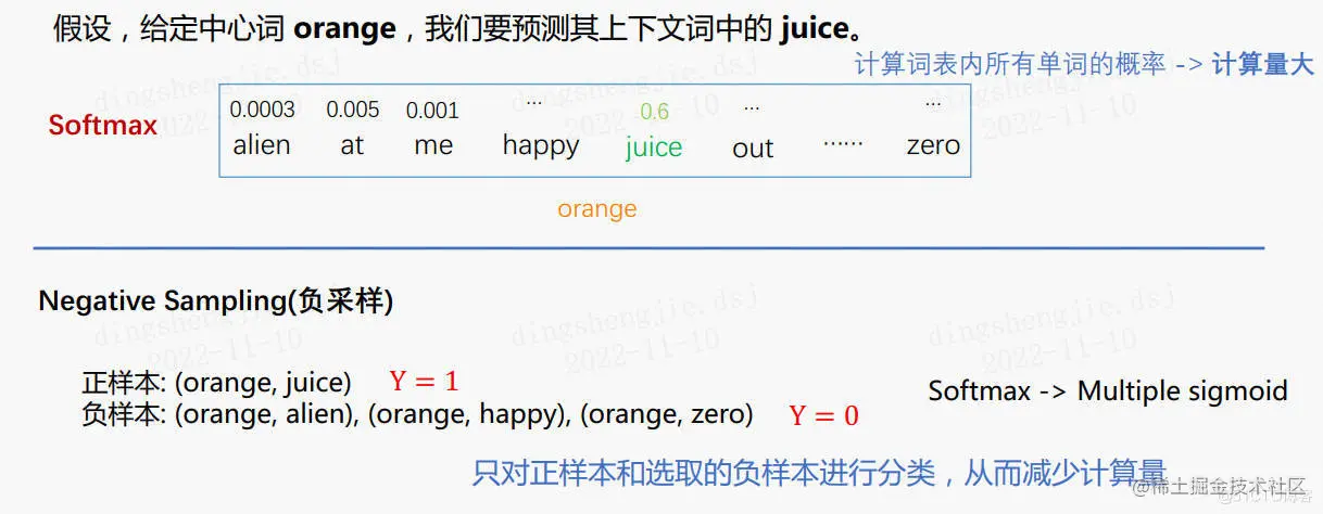 为了能够预测出 juice,不仅要预测它的概率,还要预测整个词表中所有单词的概率。但这样做的计算量是非常大的,因此,这里使用负采样的方法进行优化。