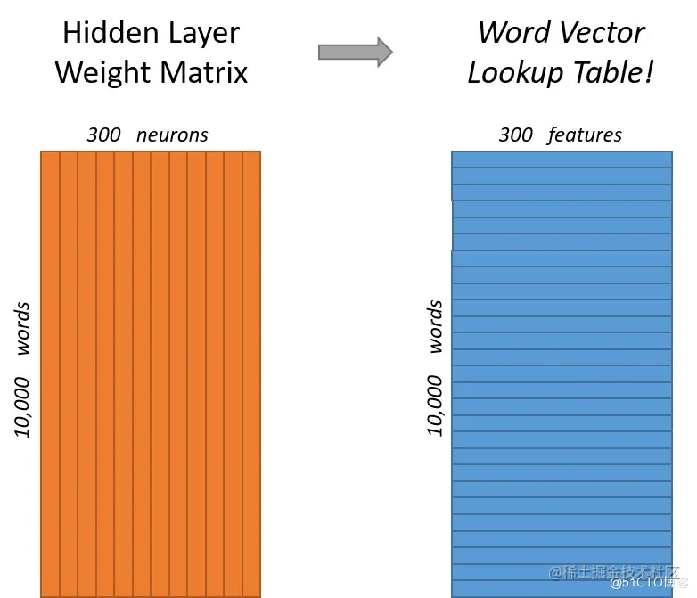 这个隐层的权重矩阵,便成了一个“查找表(lookup table)”,进行矩阵计算时,直接去查输入向量中取值为1的维度下对应的那些权重值。隐层的输出就是每个输入单词的“嵌入词向量”。