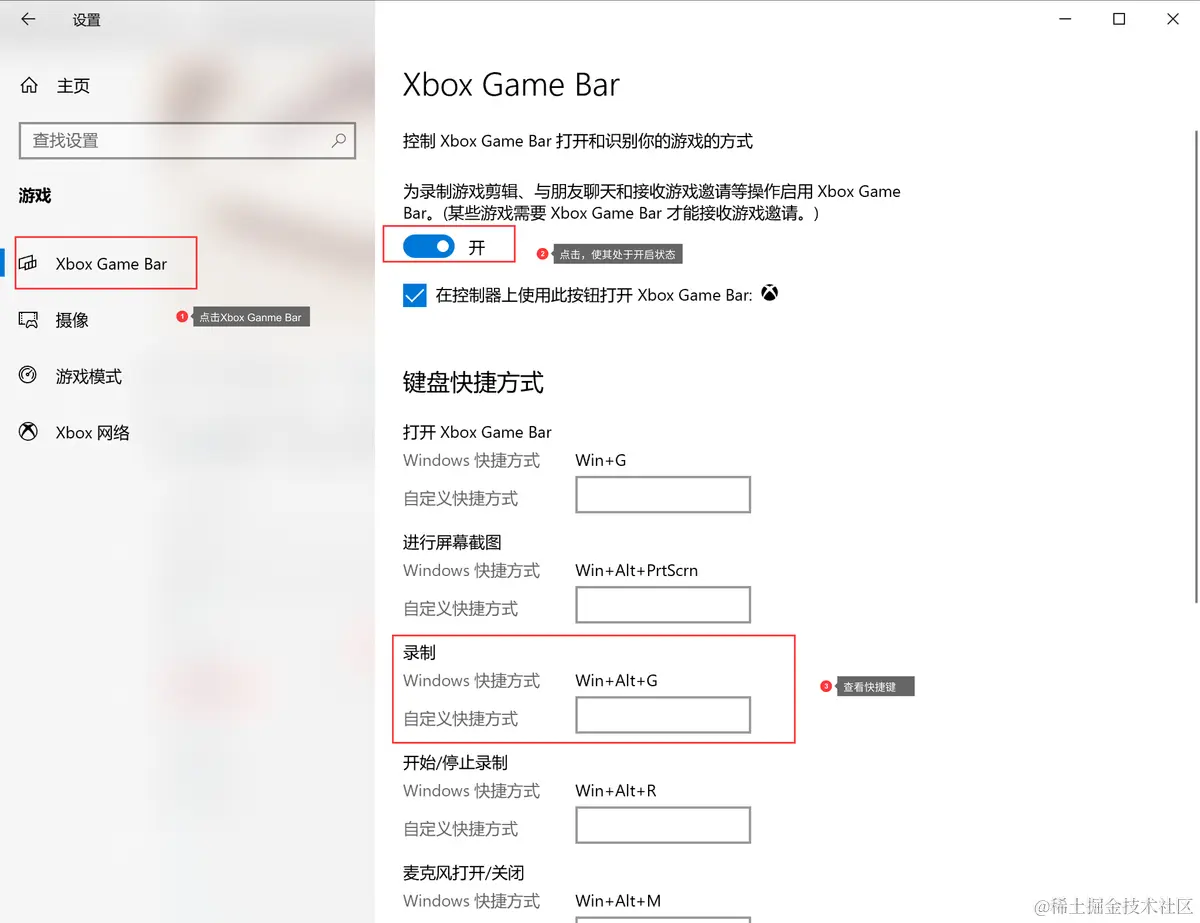 首先在开始菜单栏中,点击【设置】,接着找到并点击【Xbox Game Bar】,在右侧的具体选项中,首先打开此功能,最后查看屏幕录制的快捷键,使用快捷键【Win+Alt+G】打开屏幕录制功能,即可开始录制。