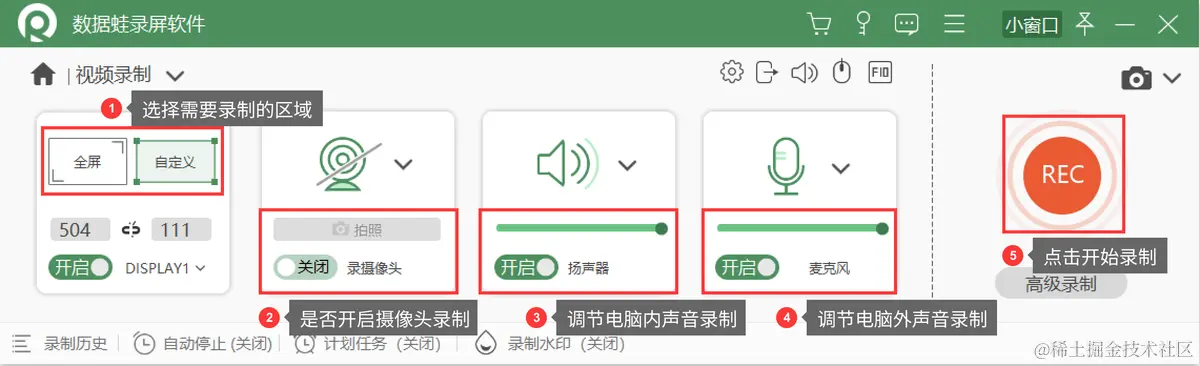 进入主界面后,点击最左侧的【视频录制】,再根据录制的需求,调整【录制区域】、【摄像头】、【扬声器】和【麦克风】,接着点击右侧的【REC】按键,即可开始录制。