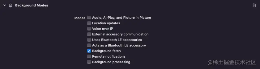 使用Xcode创建新的应用程序,默认情况下后台刷新功能是关闭的,我们可以在Capabilities标签中开启Background Modes,然后就可以勾选所需要功能了。