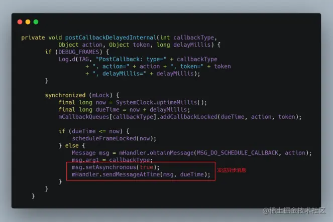 postCallback() 最终走到了 ChoreographerpostCallbackDelayedInternal():