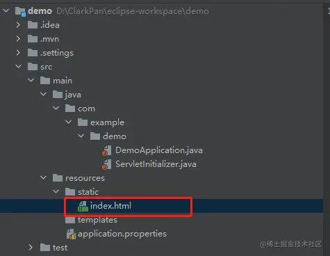 在static目录下建立index.html文件,用来绘制前端页面。如果用了thymeleaf也可以将文件建立在templates目录中。