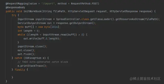 另外,我们会将流传到前端,所以会将流写到response中,所以参数中还需要response对象,方法本身不需要返回,返回空即可。原理是通过inputStream读取文件后,将其写入response的outputStream中。