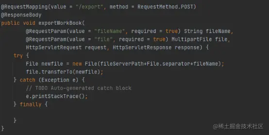 由于前端传入传入的是保存文件的名称以及文件blob文件流。服务器端需要两个参数,String用来接收文件名称,MultipartFile对象用来接收blob文件流。后端接受到文件流之后通过transferTo方法在指定目录下根军传来的fileName转存成新的文件。