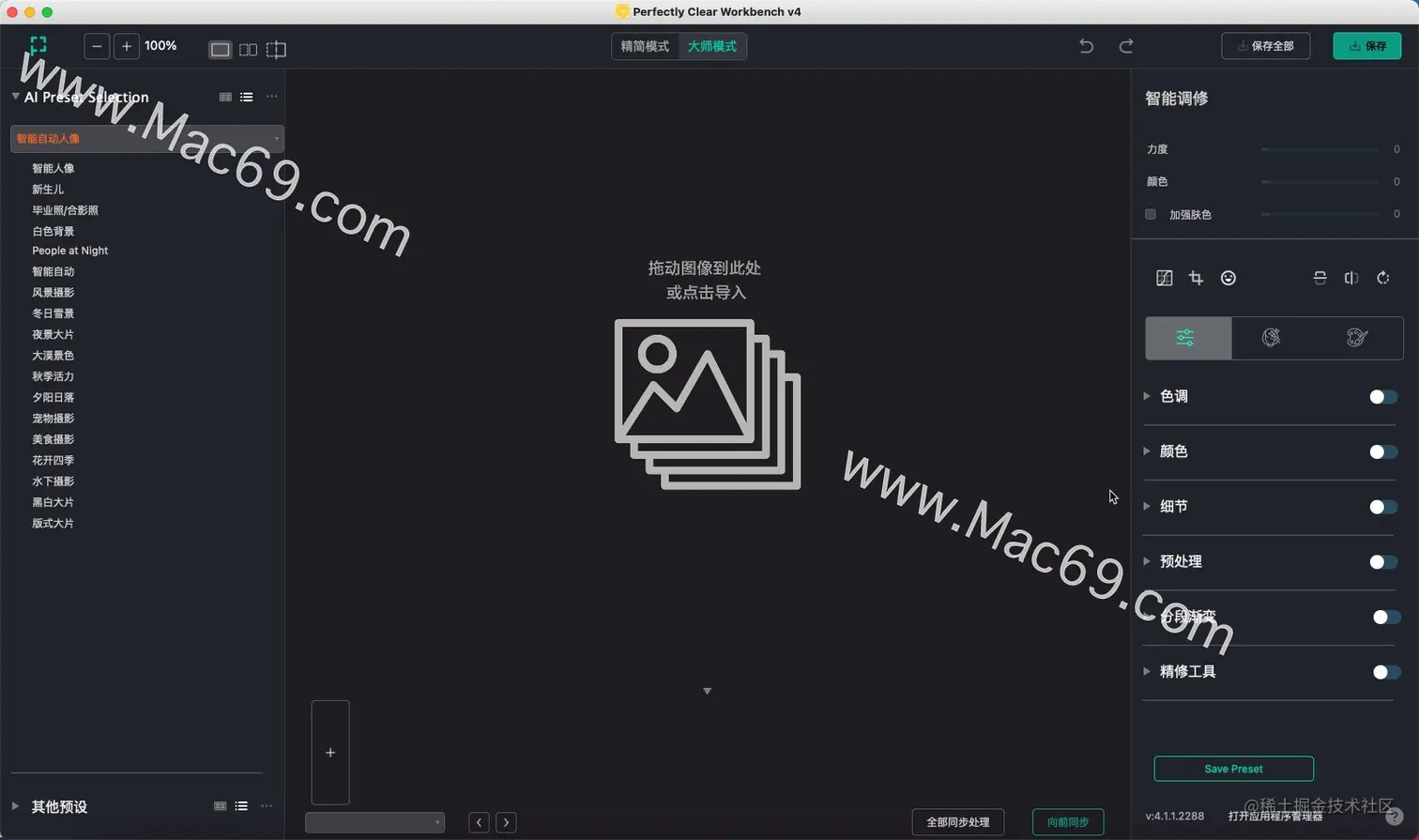 Perfectly Clear WorkBench Mac版具有强大的图像编辑技术,可为您提供最大的灵活性,在在最短的时间内为您校正照片!perfectly clear workbench中文版可以帮助您自动校正和预设照片不清晰或瑕疵;支持批量导入照片进行图像的编辑和校正操作,非常好用!