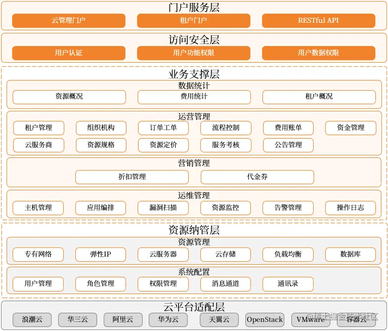 平台总体技术架构设计从下往上主要包括云平台适配层、资源纳管层、业务支撑层、访问安全层和门户服务层