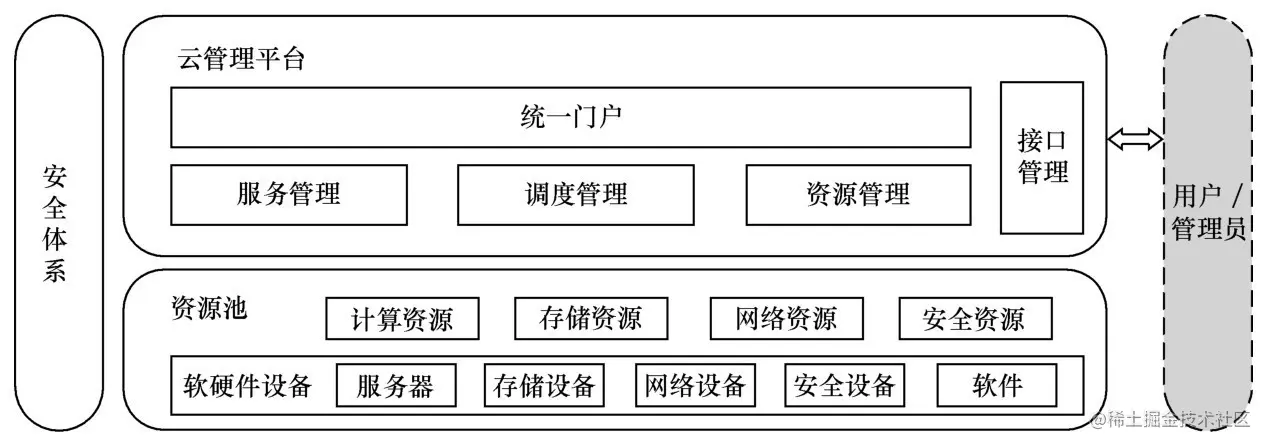 资源池包括计算资源、存储资源、网络资源和安全资源所需的服务器、存储设备、网络设备、安全设备、虚拟化软件和存储软件等相关软硬件设备。云管理平台对资源池的计算资源、存储资源、网络资源和安全资源进行统一管理调度,并为用户提供服务。安全体系通过多维、立体、完善的云安全防御、监控、分析和响应等手段支撑云服务运维运营安全,实现对云安全风险、威胁和攻击的快速发现、快速隔离和快速恢复。