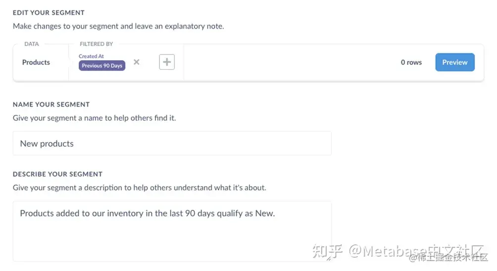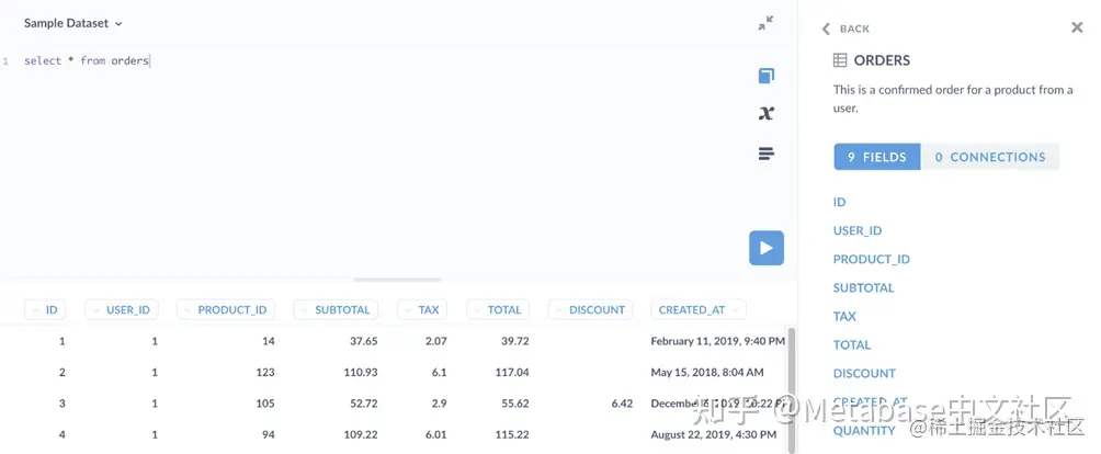 如果您发现您反复使用同一个保存的问题作为新问题的起始数据,您可能需要将保存的问题转换为一个模型,这样可以添加诸如列描述和列类型之类的元数据。您还可以在SQL查询中引用模型,就像我们上面对保存的问题所做的那样。