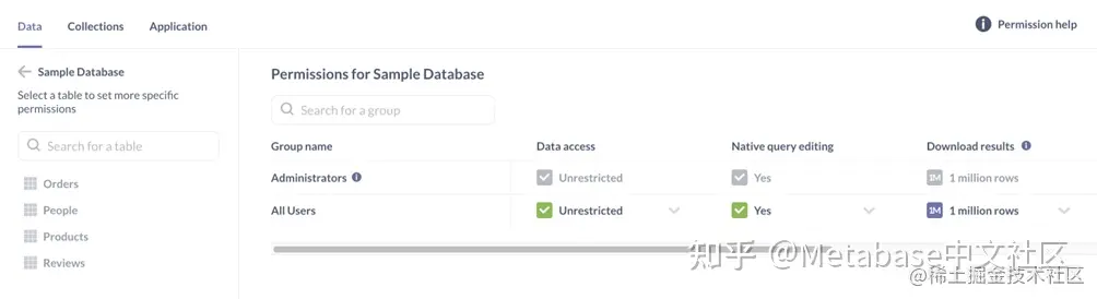 有些计划还包括设置应用程序级权限的能力:谁可以编辑Metabase设置、查看日志和调试工具,以及其他应用程序级功能。