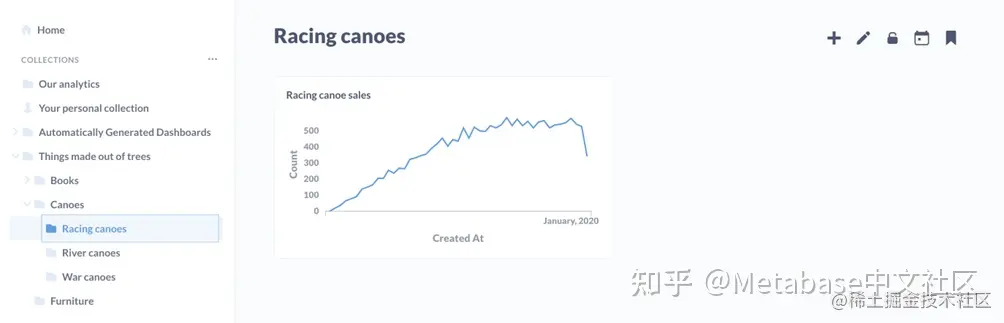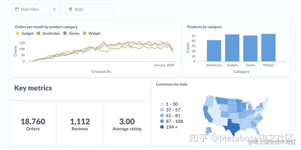 您可以保存您的问题,并将问题分组到漂亮的仪表板中。Metabase还可以方便地与团队其他成员共享问题和仪表盘。