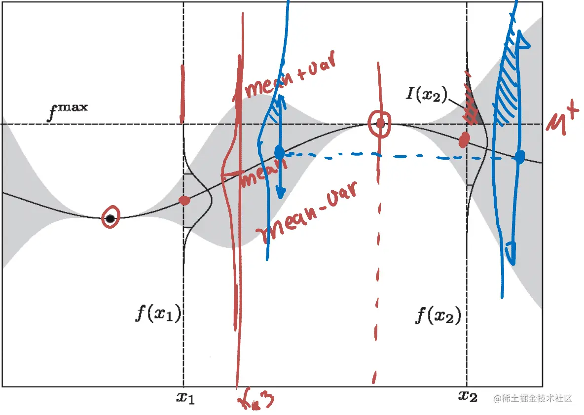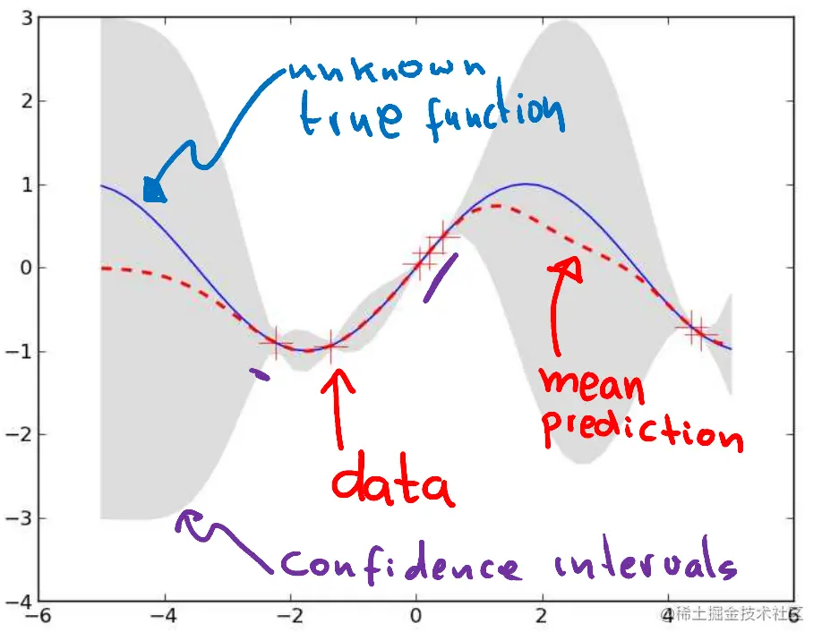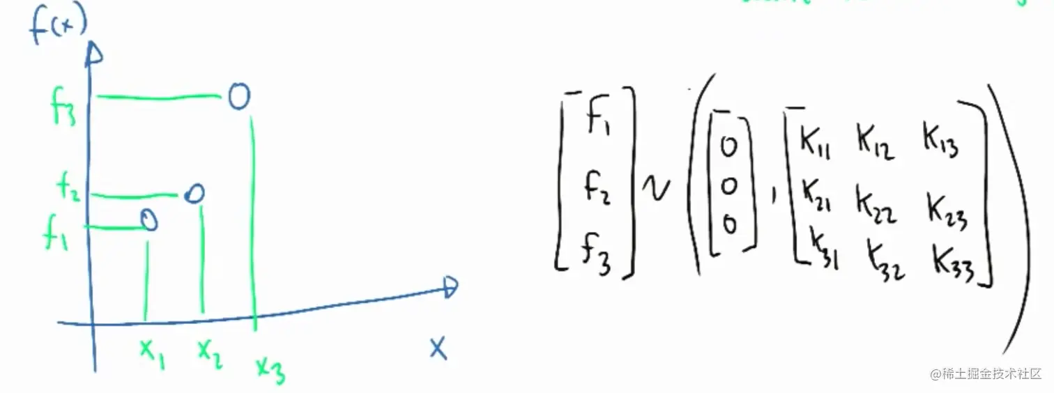 在高斯回归过程中,对于新加入的点x与之前的点构成新的多维正态分布,然后求解新加入点的边际分布即可得到新加入的点的均值与标准差。