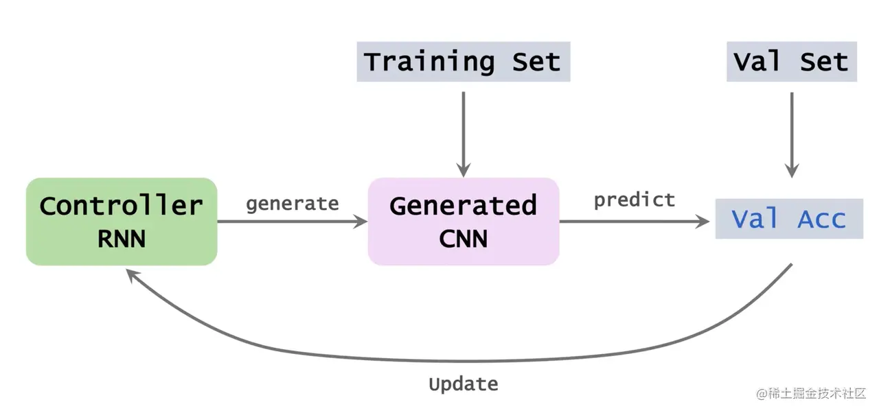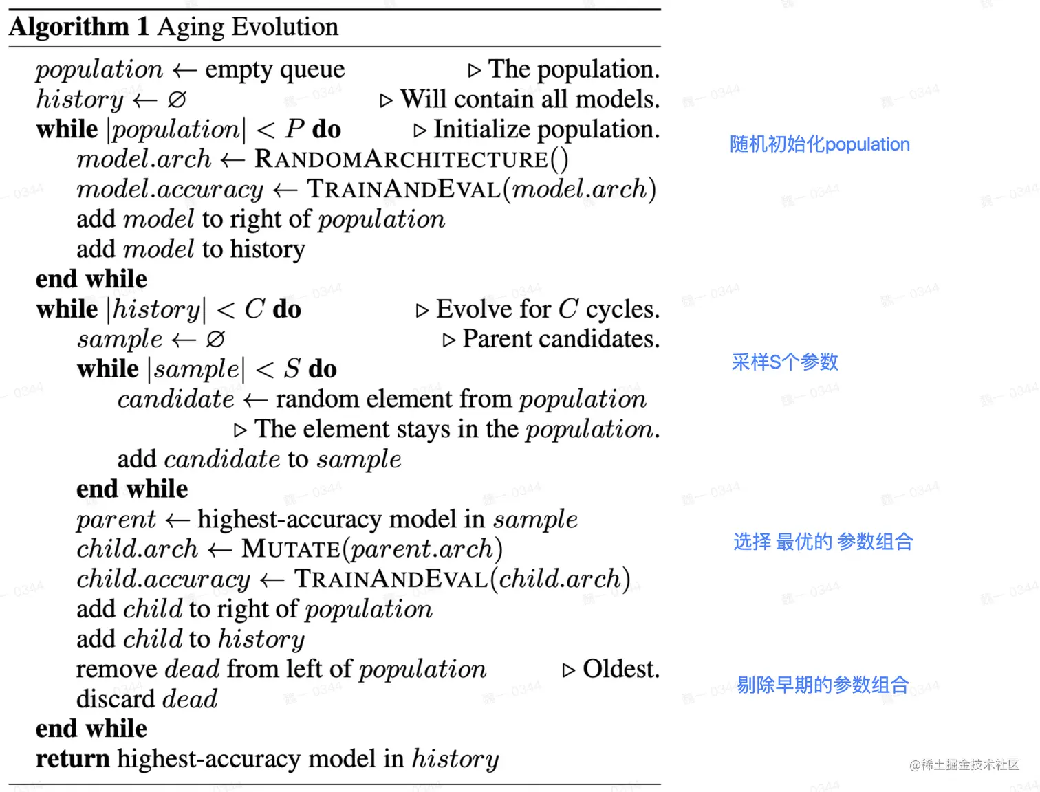 - 表现优异的个体往往更加容易留下后代。Aging evolution算法通过采样形成一个候选集,选择候选集中准确率最高的参数组合进行繁衍,以此模拟这个过程