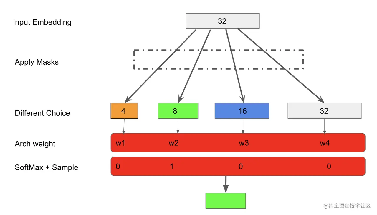 - 在模型的每个mixed operation当中sample一个op,对模型本身的参数w做gradient descent。