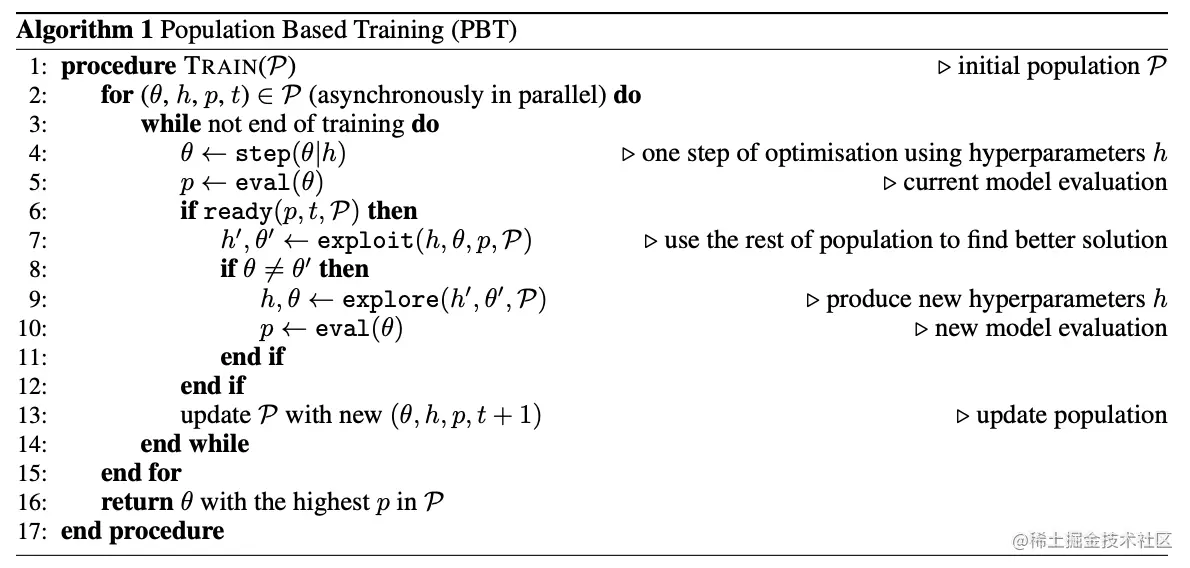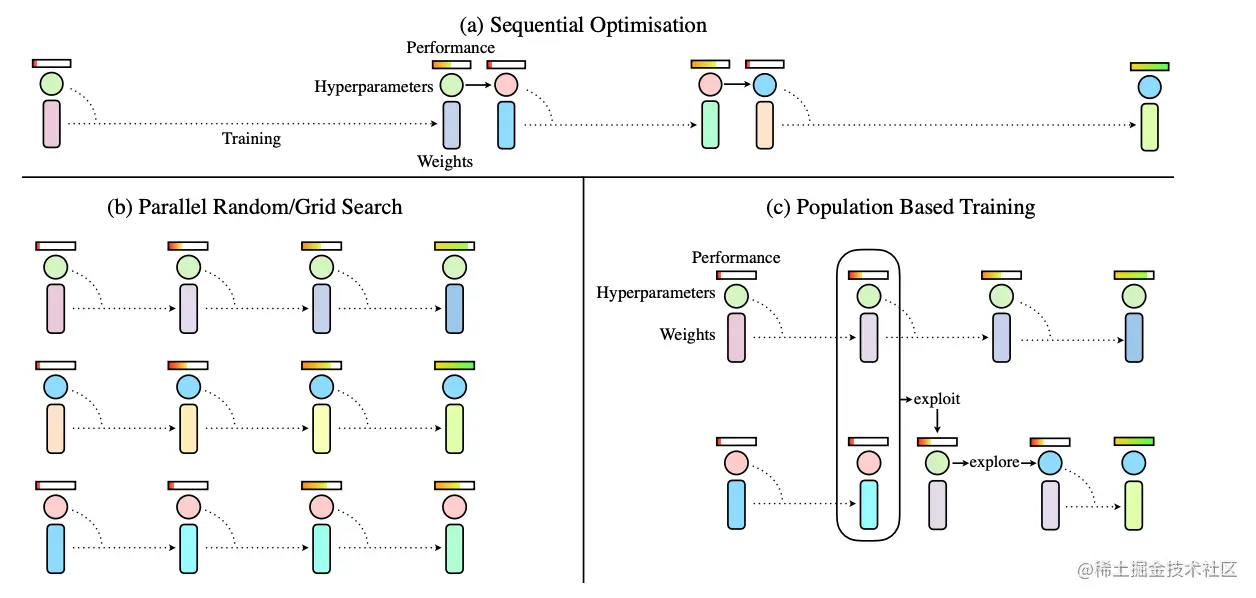 结合最优探索和并行尝试,在训练的过程中不断的进行模型的评估和排序。如果排名较低,则将被替换「用表现好的模型结果和超参数」,在此基础上进行探索。