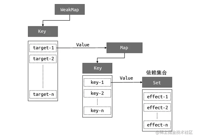 使用Map数据结构,以原始对象的key为key,副作用函数为value进行存储