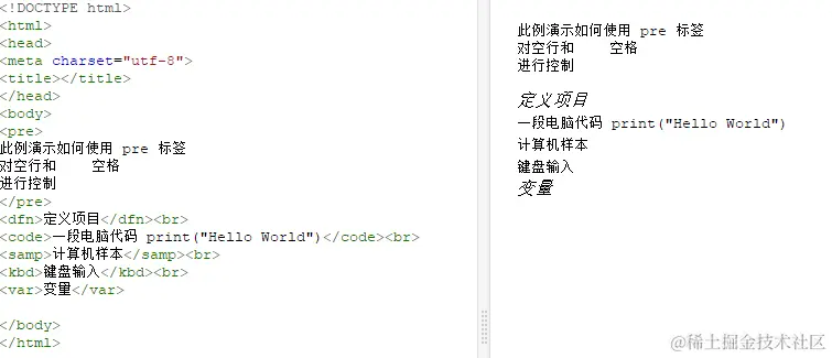 html"计算机输出"标签 1.code标签:是一个短语标签,用来定义计算机代码文本,支持html的全局属性和事件 属性。 2.kbd标签:定义键盘文本样式,用于表示用户输入,它将产生一个行内元素,以浏览器 默认monospace字体显示,支持html全局属性和事件属性,经常用在计算机相关的文档 和手册中。 3.samp标签:是一个短语标签,用来定义计算机代码样式,支持html全局属性和事件属 性 4.var标签:是一个短语标签,用来定义变量,支持html全局属性和事件属性 5.pre标签: 可定义预格式化的文本,被包围在pre标签元素中的文本通常会保留空格和 换行符。而文本也会呈现为等宽字体。一个常见应用就是用来表示计算机的源代码。 表现形式:![]()