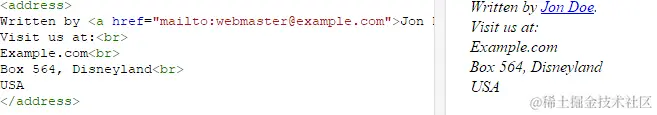 html引文,引用,及标签定义 1.abbr标签:定义缩写,支持html全局属性和事件属性 注:在某些浏览器中,当您把鼠标移至带有abbr标签的缩写词/首字母缩略词上时, abbr标签的title属性可被用来展示缩写词/首字母缩略词的完整版本。 表现形式:2.address标签:定义地址或文档作者/所有者的联系信息,文本通常呈现为斜体。 大多数浏览器会在该元素的前后添加换行,支持html全局属性和事件属性。 注:不应该使用 标签来描述邮政地址,除非这些信息是联系信息的组成部分。 address标签元素通常被包含在footer标签元素的其他信息中。 表现形式:
