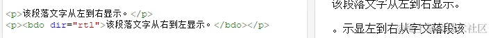 3.bdo标签:定义文字方向,可以使用dir属性中ltr和rtl值规定方向。 注:ltr是英文 left to right 的首字母缩写,即从左到右。 rtl是英文 right to left 即从右到左。 表现形式: