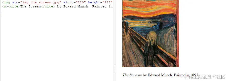 6.cite标签:定义引用,引证或定义作品(比如书籍、歌曲、电影、电视节目、 绘画、雕塑等等)的标题 表现形式: