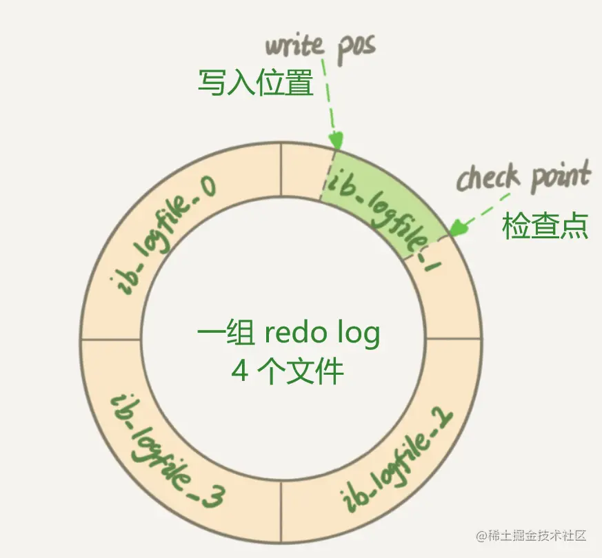 write pos 写入位置是当前记录的位置。它在书写时向后移动。写入3号文件的末尾后,将返回0号文件的开头。checkpoint 检查点是要擦除的当前位置。它也向后移动并循环。在擦除记录之前,应将记录更新为数据文件。