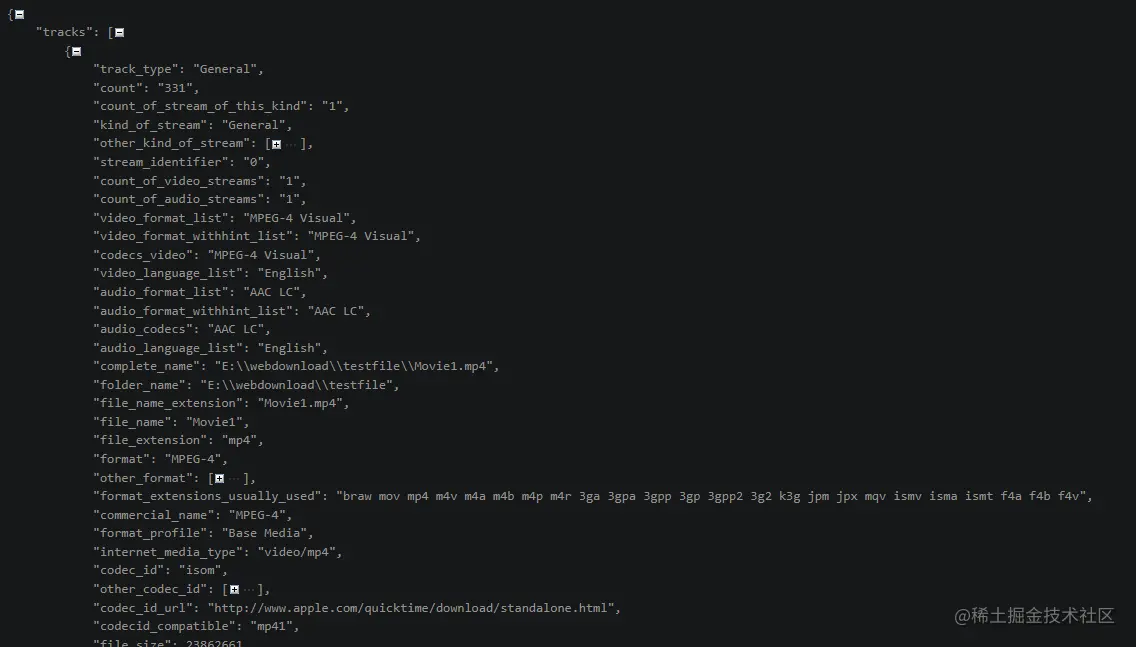查看JSON数据内容,多媒体文件信息主要包含三个部分: