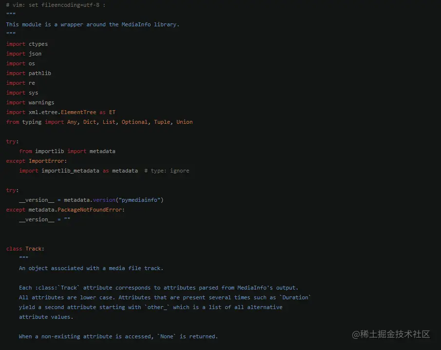 查看 pymediainfo 库源代码pymediainfo/init.py内容,可以看到pymediainfo主要有两个类:
