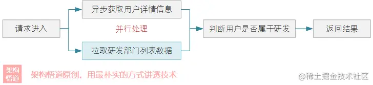 在上述代码中,需要获取到用户详情与研发部门列表信息,然后判断用户对应的部门是否属于研发部门,从而判断员工是否为研发人员。整体采用异步编程的思路,并使用了Caffeine异步缓存的操作方式,实现了用户获取与研发部门列表获取这两个耗时操作并行的处理,提升整体处理效率。