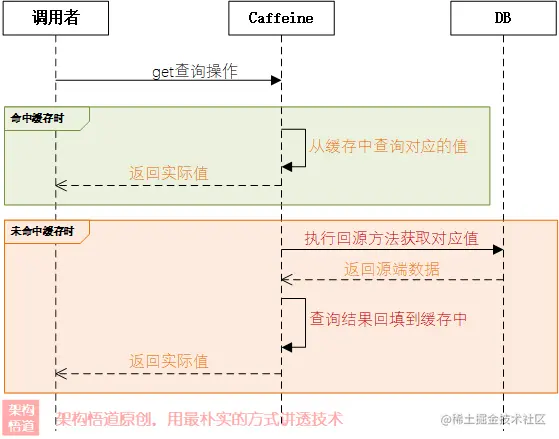 在每次get请求的时候,传入一个Callable函数式接口具体实现,当没有命中缓存的时候,Caffeine框架会执行给定的Callable实现逻辑,去获取真实的数据并且回填到缓存中,然后返回给调用方。