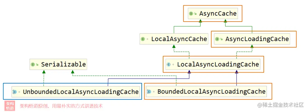 可以看出,异步缓存不同类型最终都实现了同一个AsyncCache顶层接口类,而AsyncLoadingCache作为继承自AsyncCache的子类,除具备了AsyncCache的所有接口外,还额外扩展了部分的接口,以支持未命中目标时自动使用指定的CacheLoader或者AysncCacheLoader对象去执行回源逻辑。