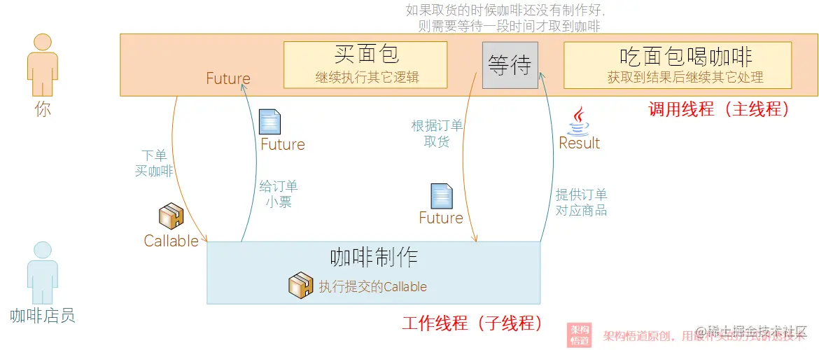 周末休息的你出去逛街,去咖啡店点了一杯咖啡,然后服务员会给你一个订单小票。 当服务员在后台制作咖啡的时候,你并没有在店里等待,而是出门到隔壁甜品店又买了个面包。 当面包买好之后,你回到咖啡店,拿着订单小票去取咖啡。 取到咖啡后,你边喝咖啡边把面包吃了……嗝~