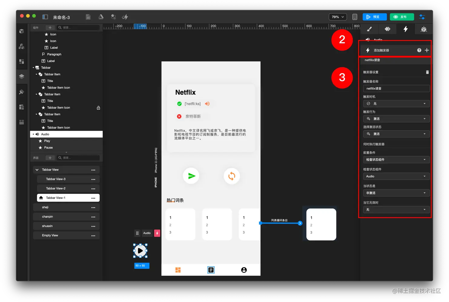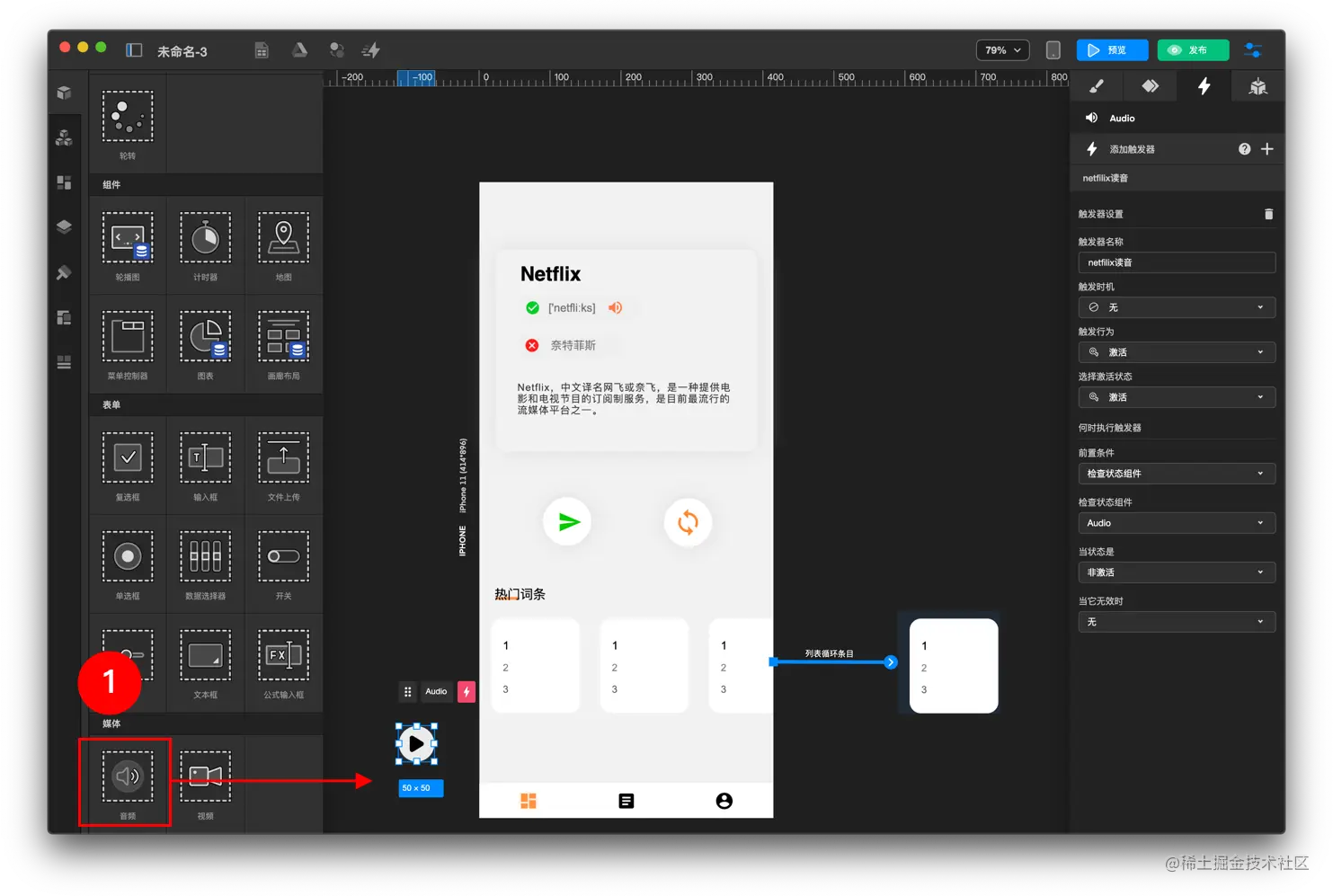 如何上传音频文件 TOWIFY 2022-11-16 114 阅读1分钟 前置准备: 音频素材 带有按钮的音频详情页面 具体步骤: 添加音频组件 配置控制按钮组件 步骤分解: 添加音频组件 添加 音频 组件 创建音频组件 触发器 配置 触发器设置 配置控制按钮组件 选中预先准备好的控制 按钮 配置按钮 触发器设置