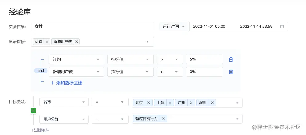 目标受众:支持筛选实验目标人群包,可按公共属性和用户分群等维度进行筛选。