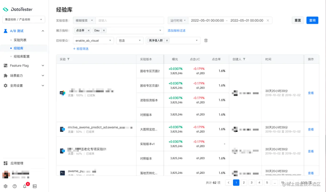 基于在字节跳动已完成 150 万余次 A/B 实验的经验,DataTester 首创了 A/B 实验经验库功能。该功能可帮助业务人员将历史的 A/B 实验经验沉淀,并通过条件筛选,快速找到所需实验信息并进行数据分析。汲取过往在 A/B 实验设计和结果方面的经验,并了解优化方向,更好为后续的业务赋能。
