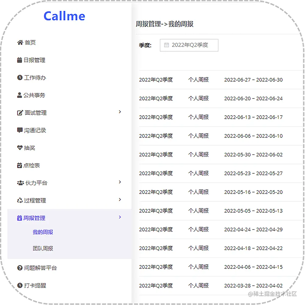 在callme中,可以看到每个人各个季度的OKR和OKR周总结的跟踪情况,保证信息的同步和透明化。callme没有复杂的功能,没有花里胡哨的操作,设计的初衷是让我们团队使用的舒服,符合我们平常的使用习惯。