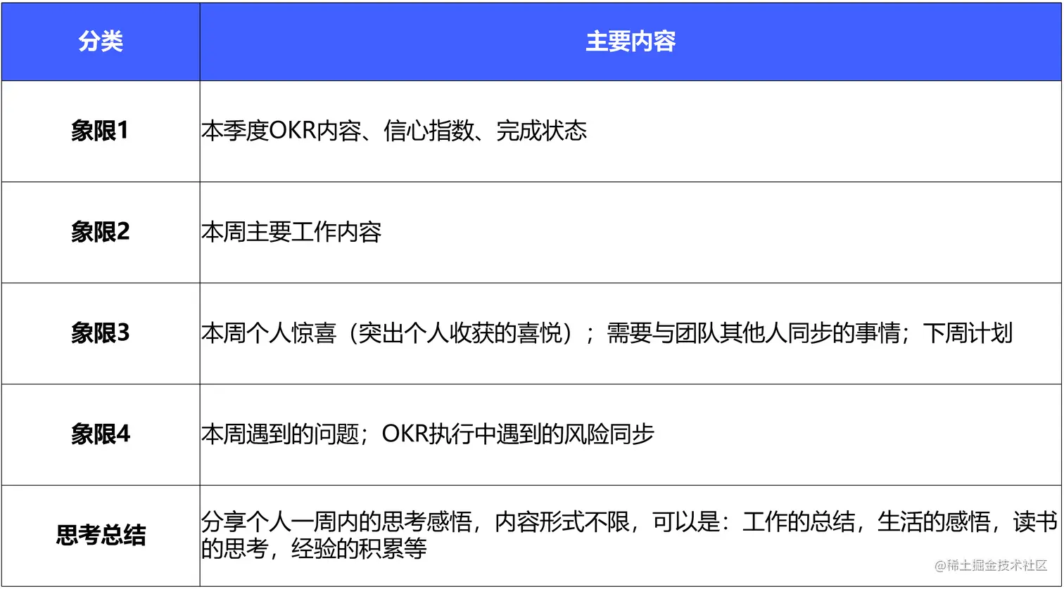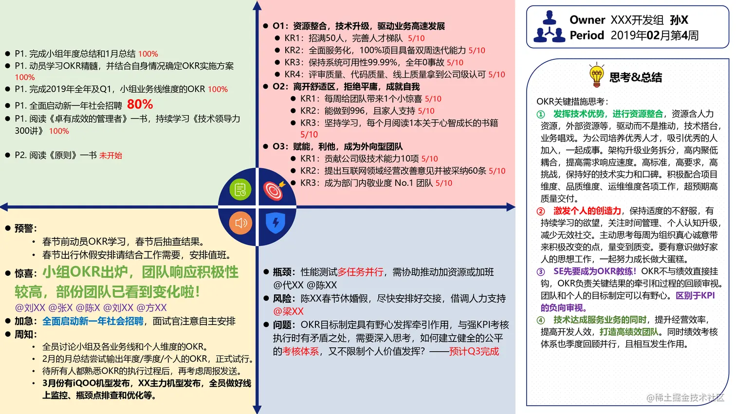 对于OKR周总结,我们团队总结了一份模板,这份模板遵循的是轻量、聚焦的原则,主要内容是4个象限+思考总结。
