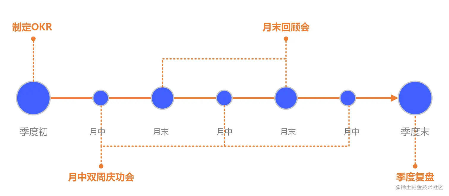 阶段3.0是在一个OKR周期(通常为1个季度)的时间线上,设置不同时间节点来围绕OKR做不同的事情。