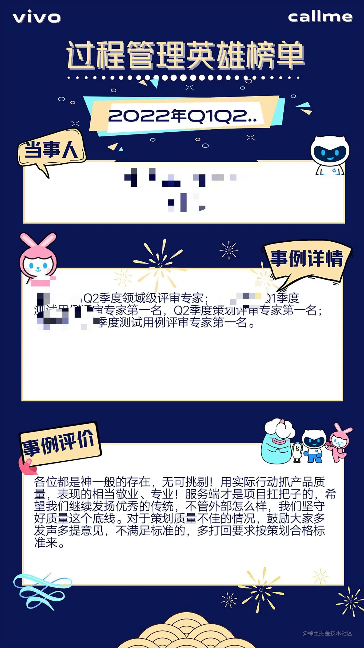 callme是优秀事例库。在callme中,我们会记录日常工作中每个人的亮光点作为事例。记录人除了团队leader,也可以是周边的同事,记录形式随意。优秀事例记录并审核通过后,会同步生成海报,自动分享至工作群内(如图4-2),将日常的优秀事例触达到团队中每一个人。这是向团队公示的一种方式:我们提倡什么,鼓励什么,给做得好的人以正反馈。同时沉淀过程数据,作为考评一个团队成员的参考,做到有迹可循。职场中评估一个人出现偏差是普遍的,比如考评者对被考评者的熟悉程度不一样,又或者考评者由于过分注重第一印象、以偏概全导致的晕轮效应(注:对方的某个特别突出的特点、品质就会掩盖人们对对方的其他品质和特点的正确了解)、近因效应(注:在总体印象形成上,最近获得的信息比原来获得的信息影响更大)等心理弊病,这些都会影响评估结果。callme优秀事例的过程记录,尽量避免或减少考评者对被考评者出现判断偏差。