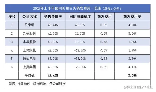 援引财经自媒体“互联新三观”的一组数据,仅2022上半年,包括云南贝泰妮生物科技集团股份有限公司、上海家化联合股份有限公司在那的6家头部化妆品公司的平均销售费用率为48.86%,而平均研发费用率在3.09%。