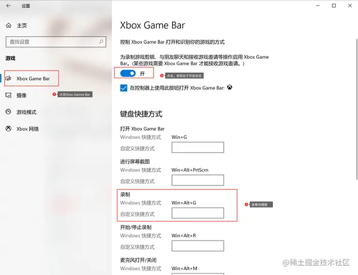 步骤1: 在“开始菜单栏”中打开“设置”,搜索并找到 “Xbox Game Bar”,点击,使其处在“开启状态”。