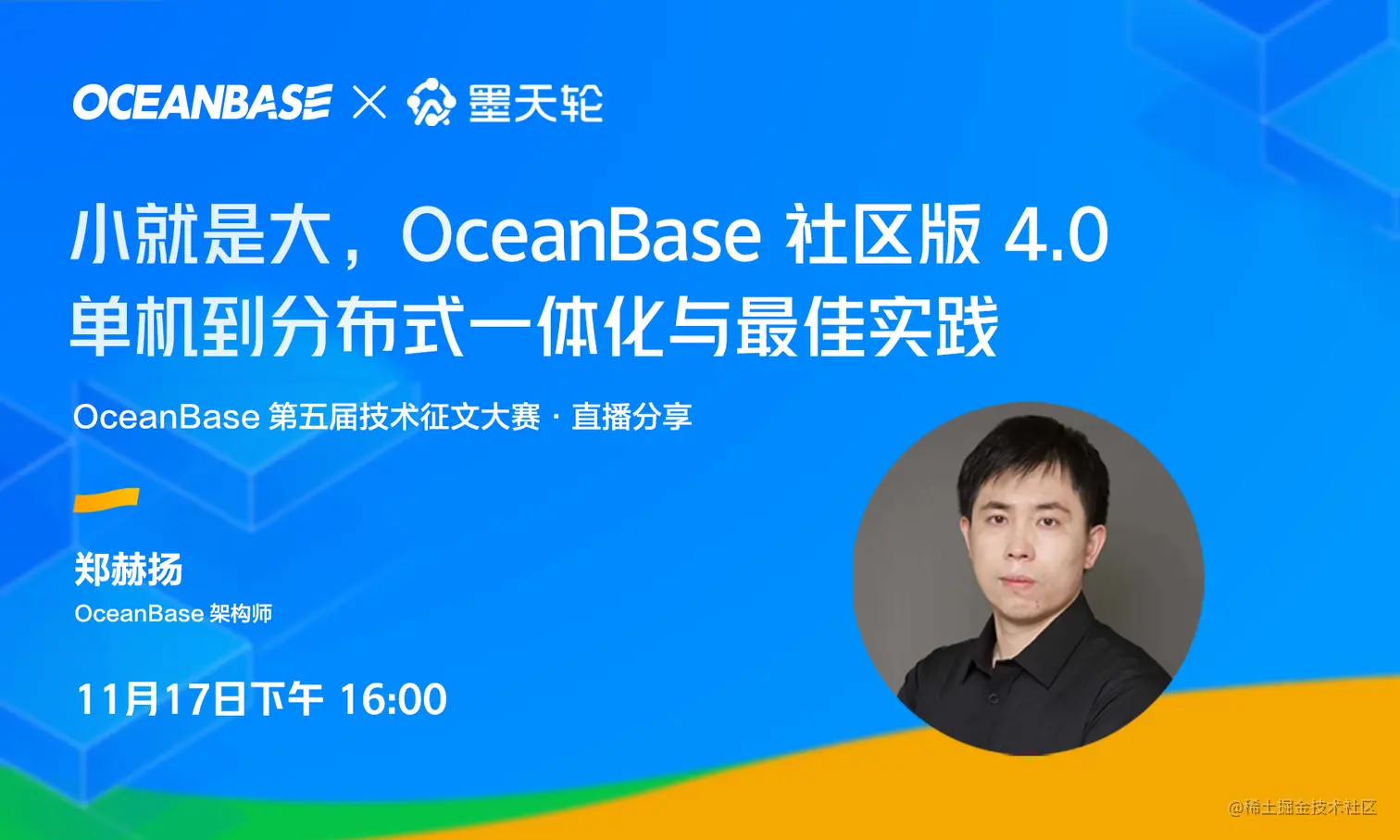 为了让更多用户了解全新的 OceanBase 社区版 4.0,分享使用 OceanBase 生态工具的实际经验,OceanBase 联合墨天轮社区于 10 月 26 日发起了第五届 OceanBase 技术征文大赛,邀请广大数据库开发者畅谈 OceanBase 生态工具。此次,我们特别邀请到了 OceanBase 架构师郑赫扬 进行分享,希望能帮大家加深了解社区版 4.0和生态工具,同时获得更多创作灵感。